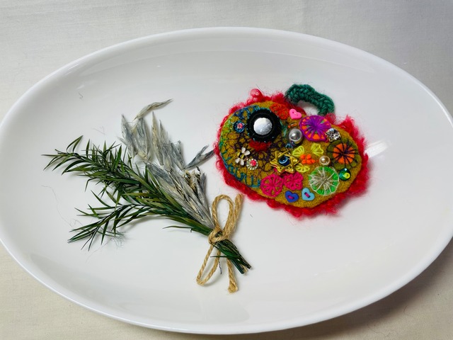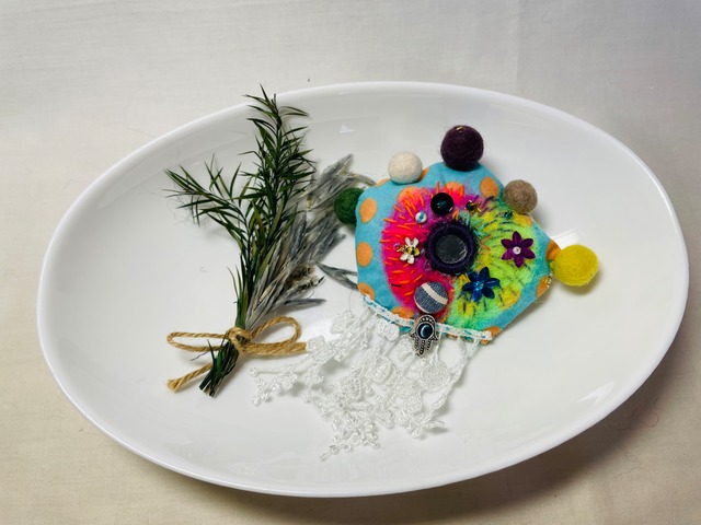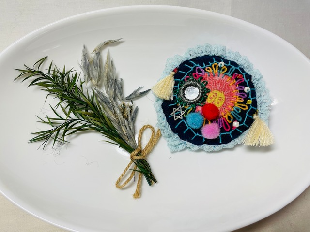 鏡守り ― 邪視を返す魔除けブローチ 邪視を跳ね返す守護のブローチ ― MIRROR TALISMAN(ミラー・タリスマン) インドで「悪意や邪視を跳ね返す」と伝えられるミラー刺繍、災いを遮り幸運を招くとされるハムサ(幸運の手)とナザールボンジュウ (邪視を青い目で跳ね返す)のチャームが 付いた守護と美を兼ね備えたタリスマンです。 ミラーは「悪意を映して持ち主に届く前に跳ね返す」と信じられ、ナザールボンジュウは古来より邪視・嫉妬・ネガティブエネルギーを 青い目玉で跳ね返し、災いが起きた際には身代わりに持ち主を守ると言い伝えられています すべてハンドメイドのため、同じものは二つと存在しない一点物 身に着けることで、 ・人からの悪意を遠ざけたいとき ・大切な勝負の日 ・人前に立つとき ・お守りとして日常的に あなたを静かに守り続けます “守られる安心感”と、“特別な美しさ”を 同時にまとう それは、アクセサリーを 超えたお守りブローチです このブローチは単なる装飾ではありません それは、あなたのそばで目を覚まし、守り続けるタリスマン 身に着けるたびに、 他人の嫉妬や悪意を遠ざけ 心の揺らぎを鎮め 持ち主のオーラを静かに強化すると 言われています 同じ護符は二つと存在しません それぞれが**“選ばれた持ち主”を待つ一点物**です 直径 10.5㎝×8.5㎝