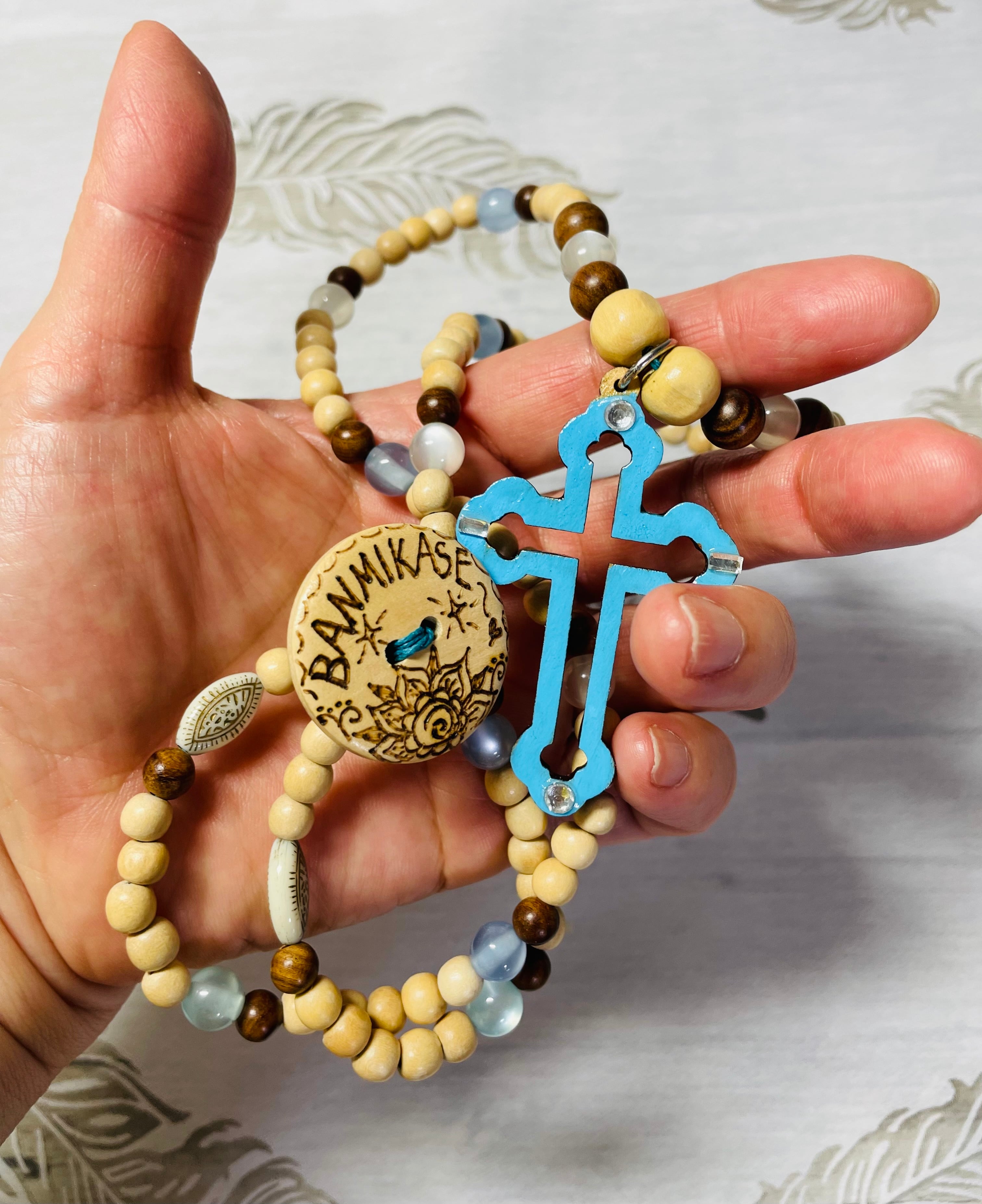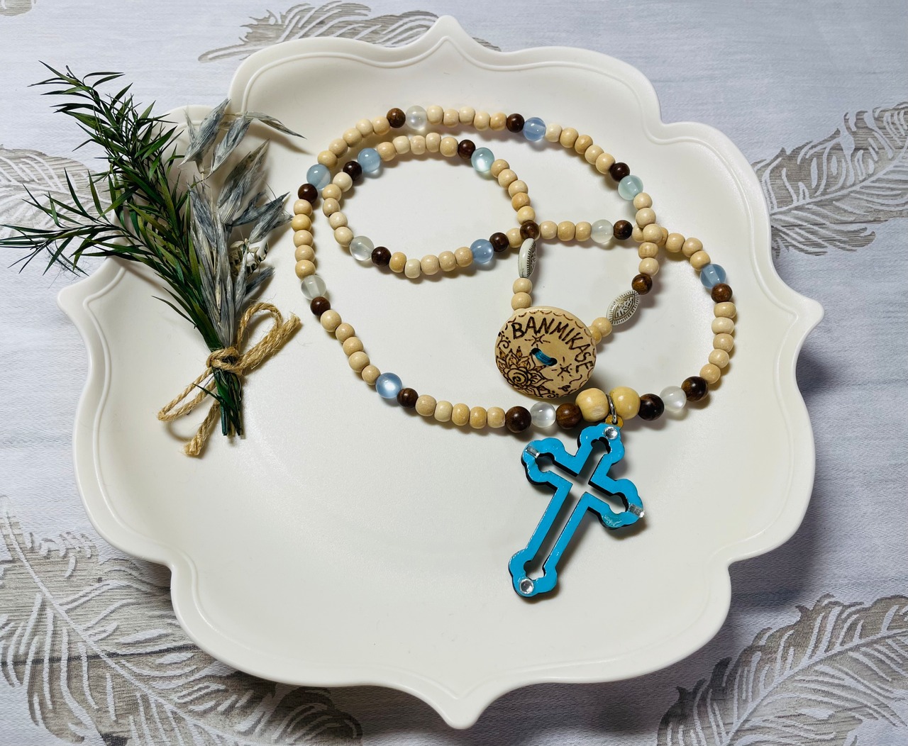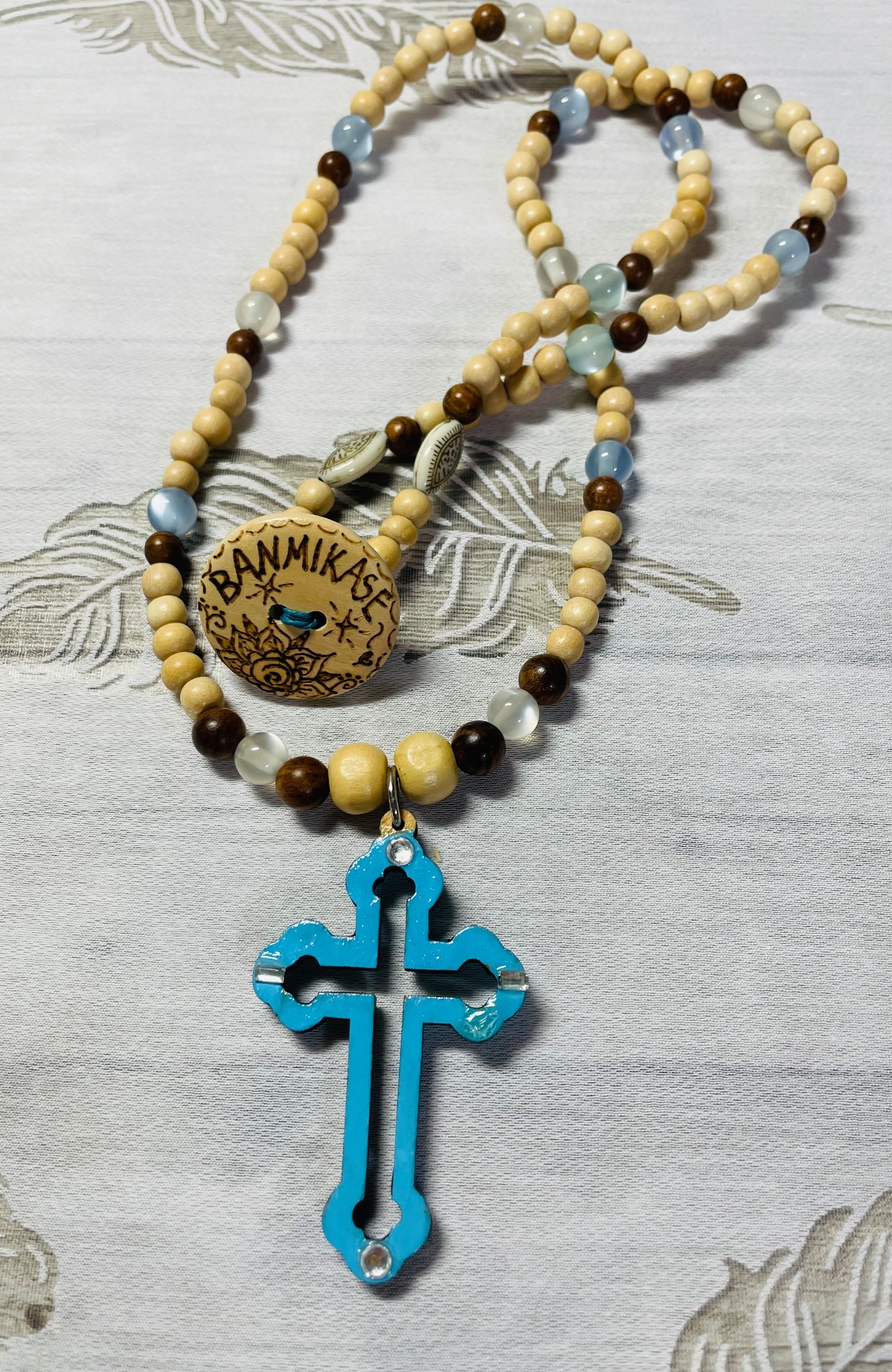長さ76㎝ 素材:ウッドビーズ、アクリルガラスビーズ、アクリルビーズ、ウッド十字架